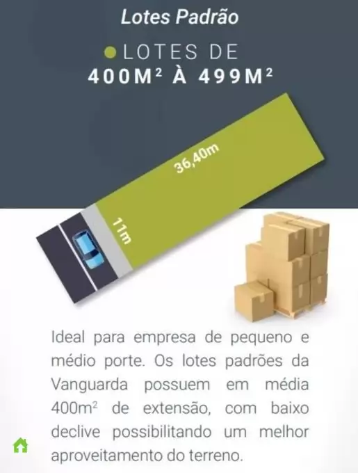 -Lotes de 400m2 à partir de R$210.790,00 que podem ser unificados e ampliados se compradas unidades lado a lado; -Localização estratégica com acesso privilegiado pela Rodovia do Açúcar; -Infraestrutura completa; -Lotes à partir de R$210.790,00